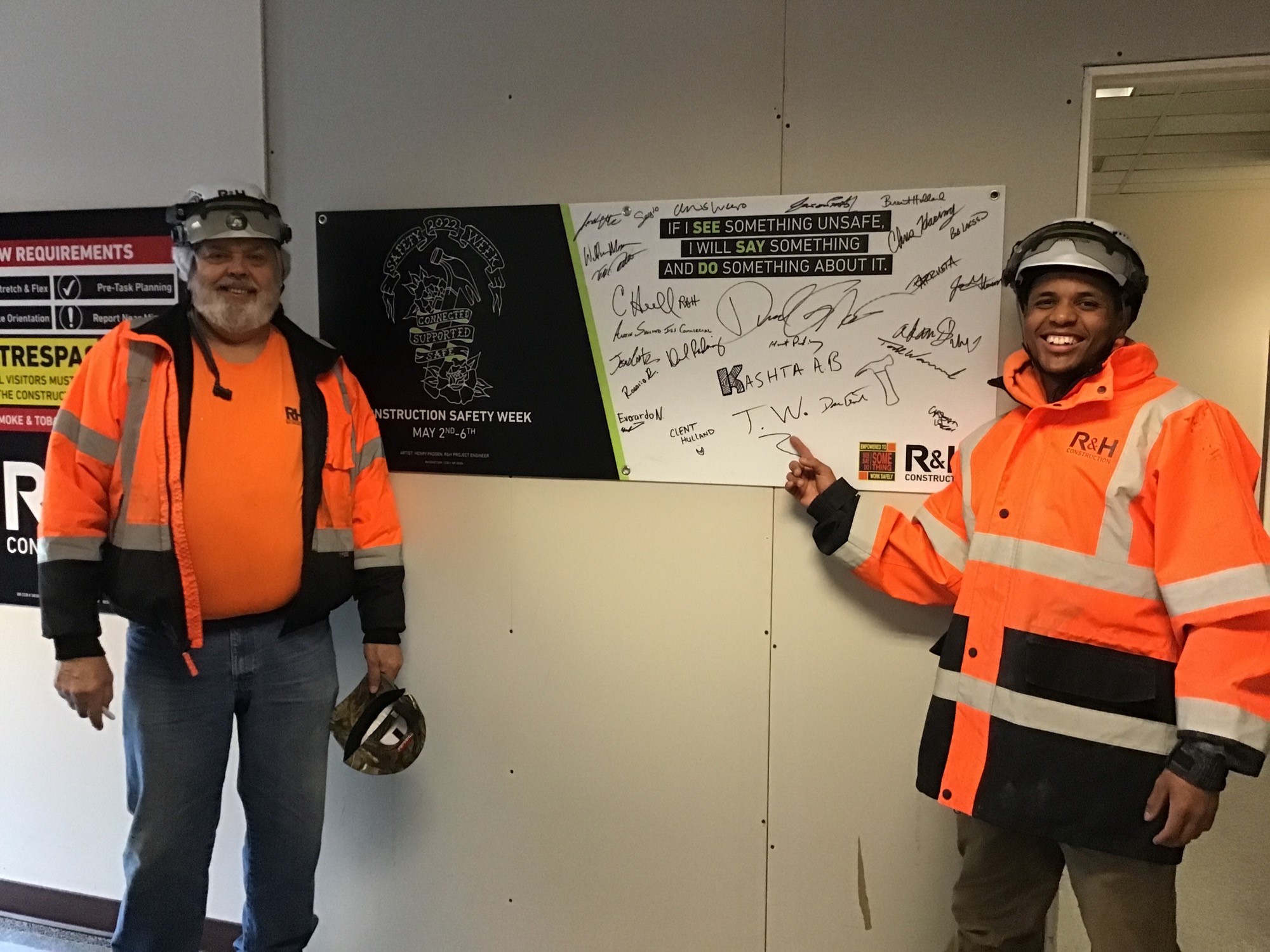 On Monday, we kicked-off Safety Week with a safety commitment statement and banner signing. The safety commitment stated, “If I see something unsafe, I will say something and do something about it.” Each project site received a commitment banner and superintendents encouraged team members and subcontractors to sign their names, as a site wide commitment to safety. The commitment statement was a nod to R&H’s historic “See, Say, Do” campaigns, which highlighted the importance of recognizing an unsafe action, calling attention to it, and taking to ensure that something is done to correct the action.
