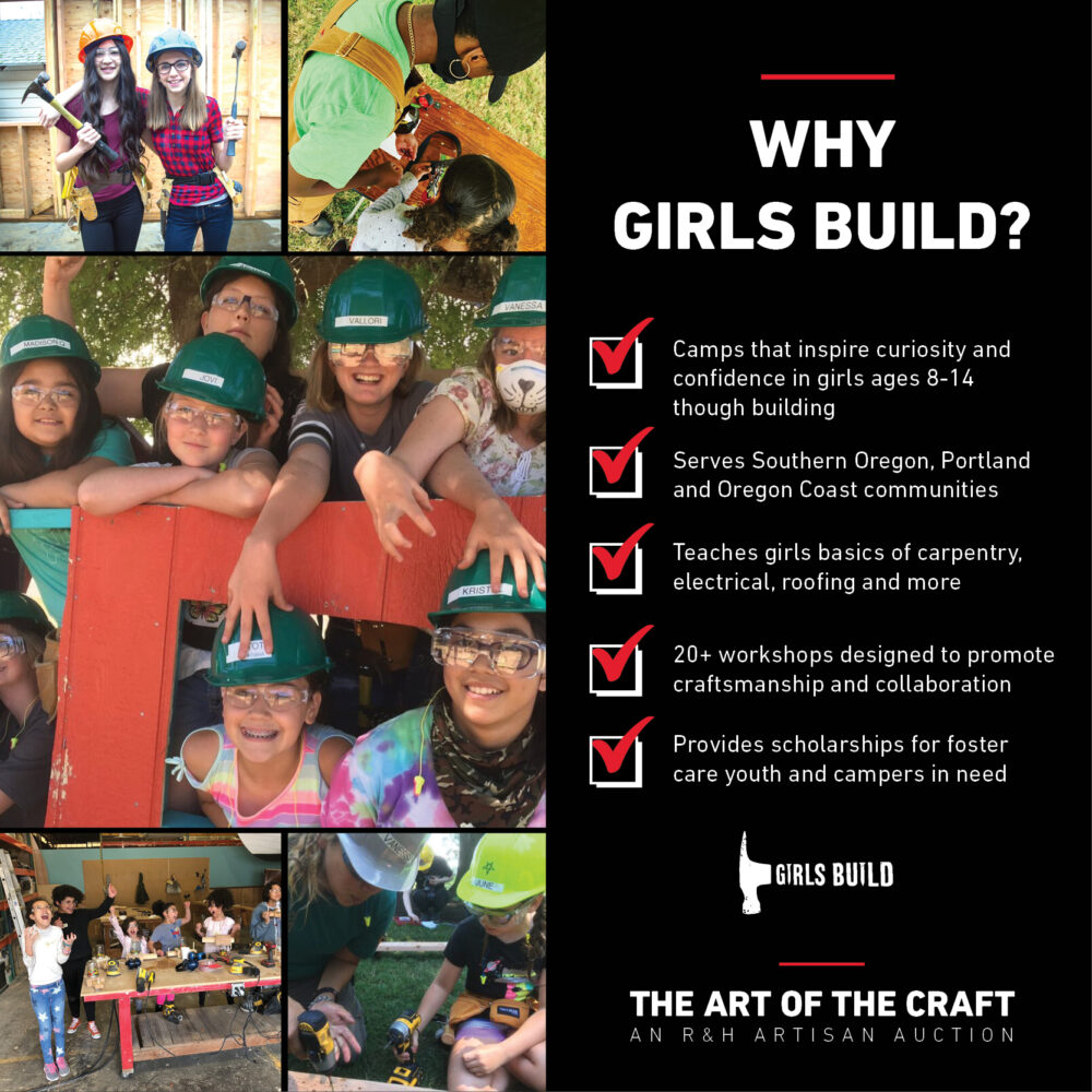 We’re looking back at the highlights of our virtual holiday auction, “The Art of the Craft: An R&H Artisan Auction.” This event brought our company’s values to the forefront as we blended the importance of craftsmanship with our passion for community service by celebrating our talented artisans and supporting trades education in Oregon. By the end of our auction, we surpassed our goals and raised over $10,000 for Oregon-based locally-rooted Girls Build and Heart of Oregon.