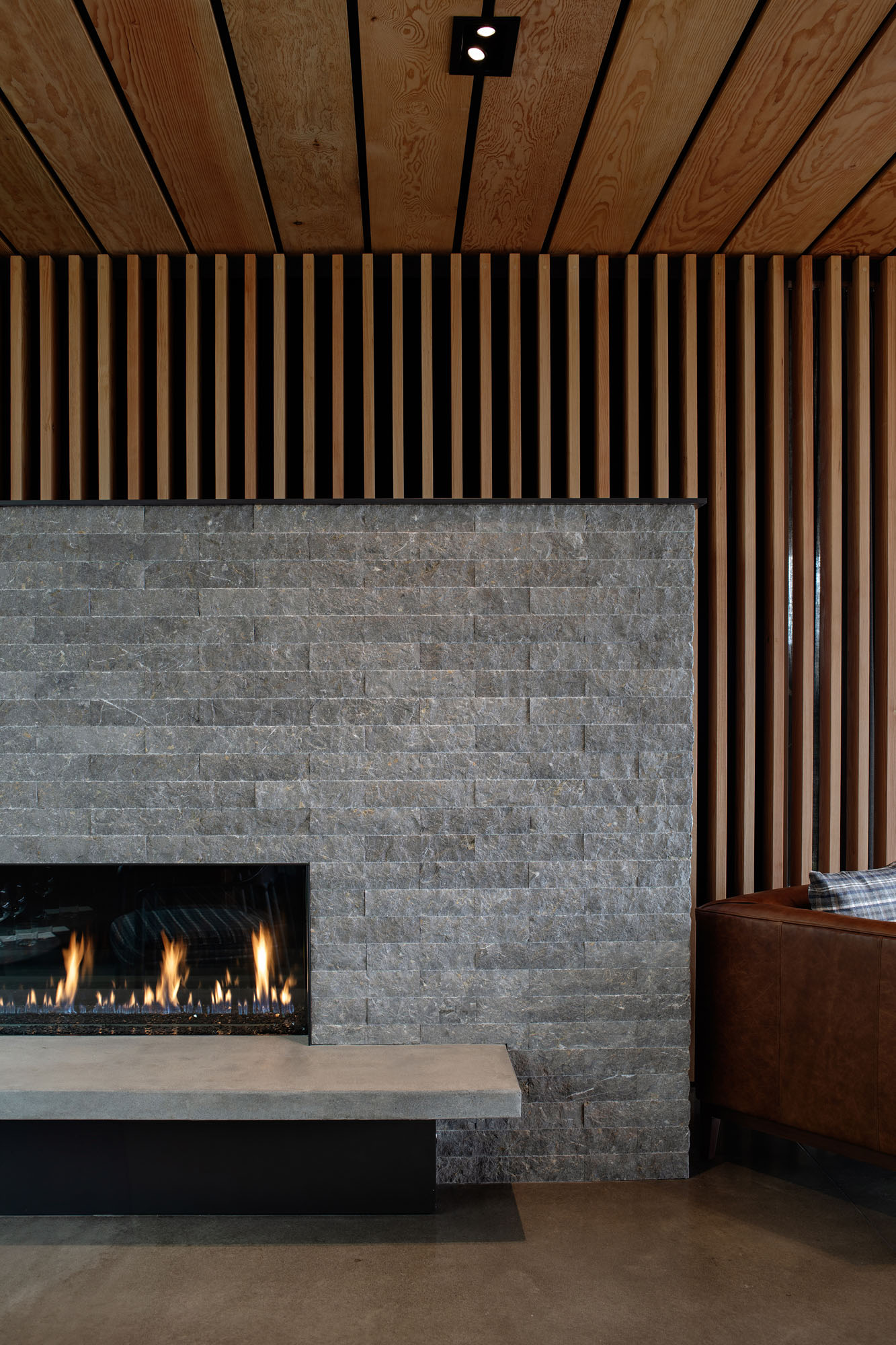Inside the structure is a beautiful yet inviting space that creates a lively atmosphere. The 2,600 s.f. room triples Archery Summit’s previous tasting space, giving them the ability to entertain more guests as well as create a luxury tasting experience through carefully-constructed details such as a fireplace and custom skylight. The continuous 42’ skylight, which is situated above the north side of the building opposite the colonnade, washes the wall with light, balancing light within the space, while trees planted inside below the skylight serve to connect inside with outside in a meaningful way. A tiled fireplace brings warmth and light into the space, creating year-round ambiance that is especially beneficial during Oregon’s long rainy season. On the east side of the Tasting House is a separate space, able to be closed-off from the remaining tasting room. This space allows Archery Summit to better entertain VIP guests, such as wine critics and club members, in a way that allows for privacy and more in-depth conversation. Beyond private space, the Tasting House has a variety of seating options for groups of all sizes. The tasting room is situated around the cave entrance, as intended. The existing wood doors were replaced with custom glass doors which welcome the ambiance of the caves into the tasting room, uniting these two unique experiences.