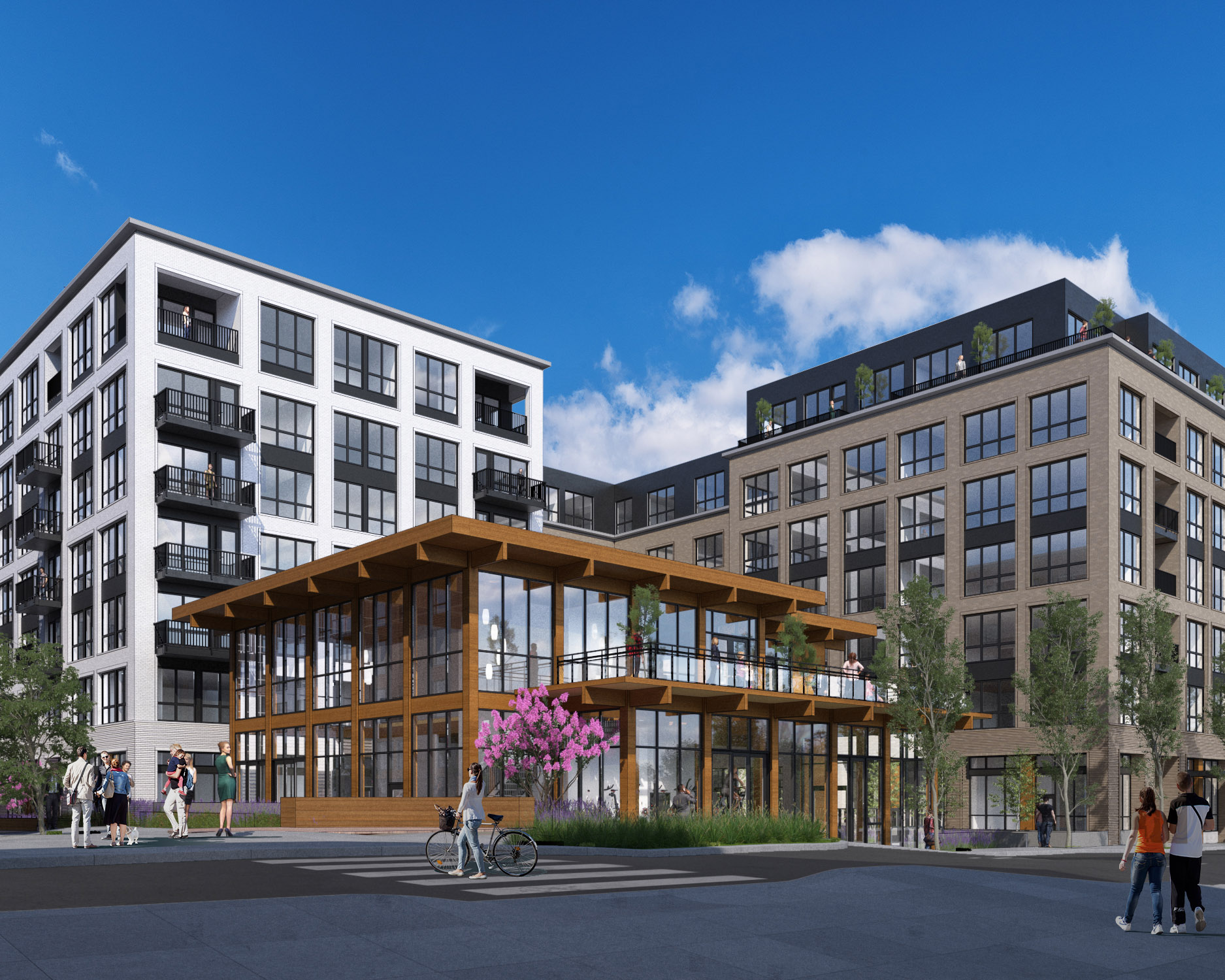 Located in Slabtown, this seven-story mixed-use building will offer 192 residential units in addition to commercial space and underground parking. A second-story pedestrian bridge connects the main building to a two-story pavilion offering resident amenities such as a fitness center, club room, outdoor terrace and maker’s lab.
