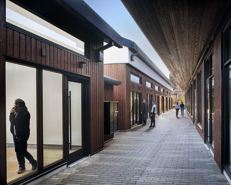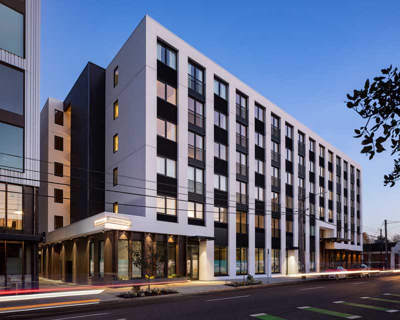 Nestled between NE Ivy and NE Fremont on N Williams Avenue, the 110,000 s.f. development is essentially two buildings, united by a six-story open-air atrium featuring zig-zagging CLT corridors, hence its name: The Canyons. In addition to residential units and ground-floor retail space, The Canyons also features The Alley, an 11-unit commercial marketplace designed to unite building residents, community members and local small businesses in one central location.
