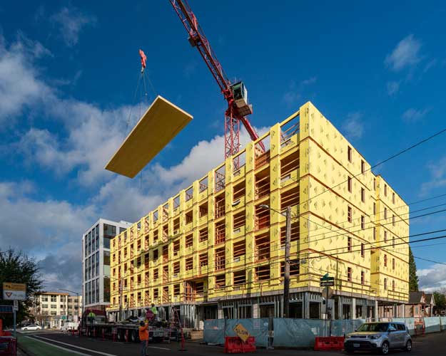 It’s beautiful: Together with the advantages to the environment and to the project, using CLT provides several benefits to residents at The Canyons. The CLT can be seen throughout the building including within each unit. All units feature a beautiful exposed wood ceiling that brings warmth and a natural element into each apartment. Wood is known to have a relaxing effect on people, providing a sense of calm in apartments which is especially beneficial in a COVID-era environment where residents are working from their homes. In The Canyons, the wood invites the beauty of the Pacific Northwest indoors and into each residents’ living spaces.
