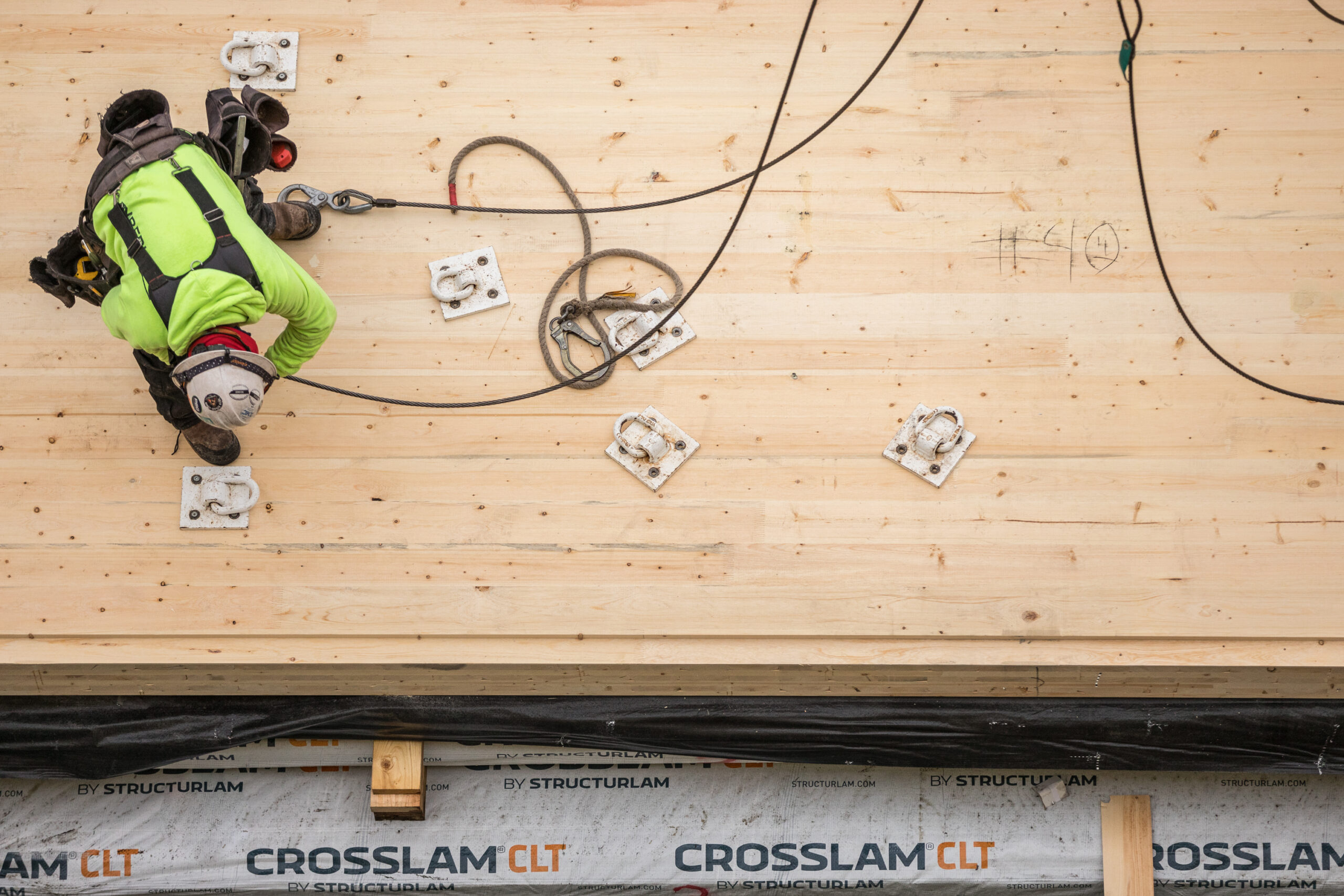 It’s faster: In addition to the positive sustainability and durability elements, building with this product is also beneficial in terms of schedule and budget. In comparison to concrete, building with CLT at The Canyons saved over a week per floor during vertical construction. This faster, more efficient CLT installation process can be seen in the timelapse below. The reduction in schedule also led to cost savings and increased efficiency for subcontracting trades that followed framing.