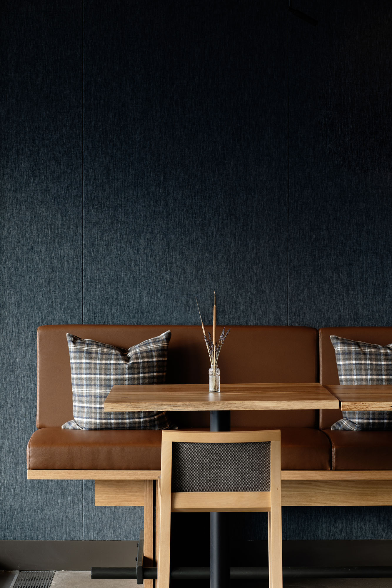 Archery Summit’s custom wood ceiling is one of the tasting room’s most striking features. The wood flows seamlessly from the interior of the tasting room to the exterior patio, beautifully uniting the two spaces. The ceiling has a removeable clip system, allowing the Archery Summit facilities team or tradesworkers to easily access junction boxes, electrical and low voltage while also maintaining a clean visual for guests. Each of the roughly 273 wood boards was custom cut allowing for the one inch reveals between each board and alignment with all adjacent finishes creating symmetry throughout the space.