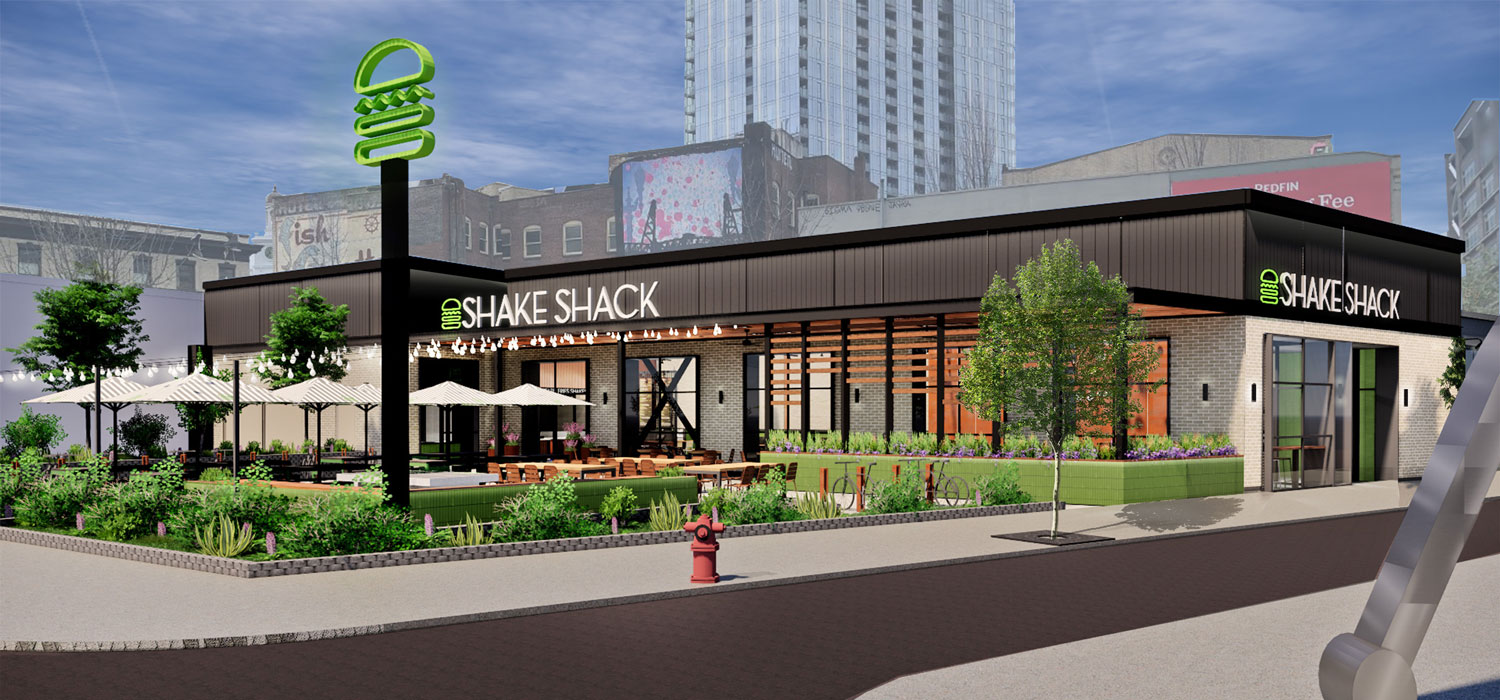 In 2023, Shake Shack will open their second Oregon location in Downtown Portland. Located across Burnside Street from Powell’s Books, the 4,900 s.f. renovation will include a full kitchen buildout, a new roof, upgraded utilities and a hardscaped patio with an Ipe wood canopy, slat wall and bench seating. Architect: Aria Group