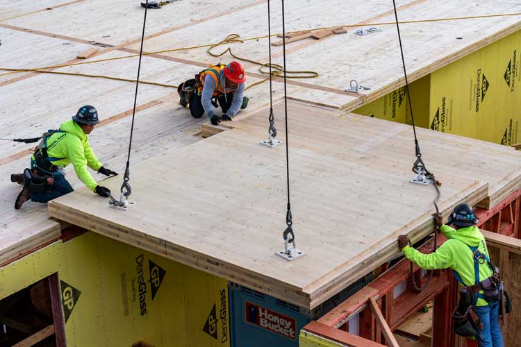 It’s faster: In addition to the positive sustainability and durability elements, building with this product is also beneficial in terms of schedule and budget. In comparison to concrete, building with CLT at The Canyons saved over a week per floor during vertical construction. This faster, more efficient CLT installation process can be seen in the timelapse below. The reduction in schedule also led to cost savings and increased efficiency for subcontracting trades that followed framing.