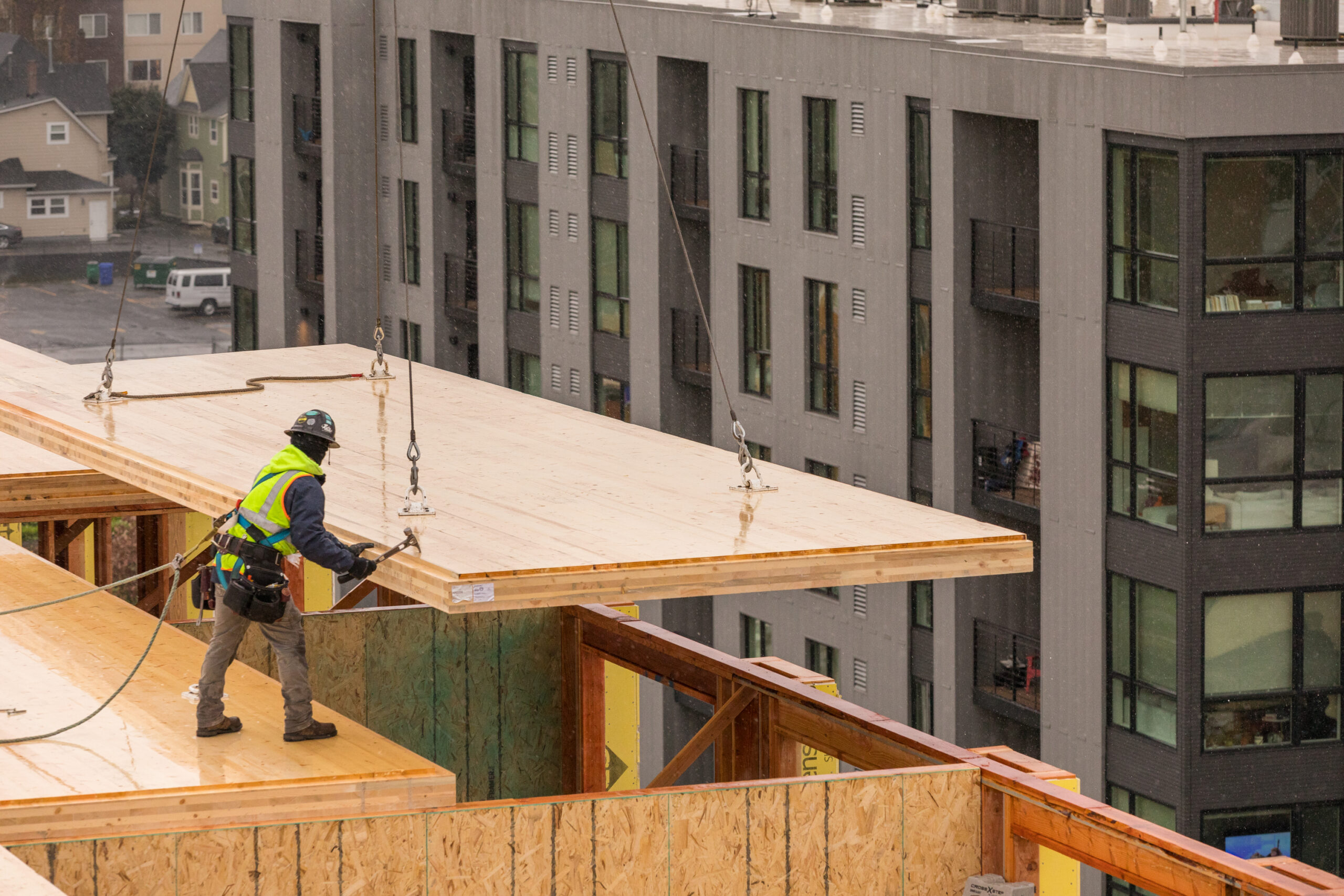 It’s durable: CLT is produced by gluing together solid-sawn lumber in perpendicular layers to create sturdy, stable panels up to a foot thick. CLT is also one of the most seismically resilient building materials available which is an important factor for buildings in the Pacific Northwest. The joints between CLT boards allow buildings to dissipate energy efficiently, minimizing structural damage during an earthquake. Because of the thickness associated with large structural wood elements, mass timber is naturally fire resistant. When burned, the charred layer on the outside creates a protective seal, preventing the inner layers of wood from burning.