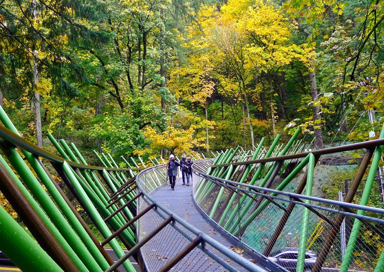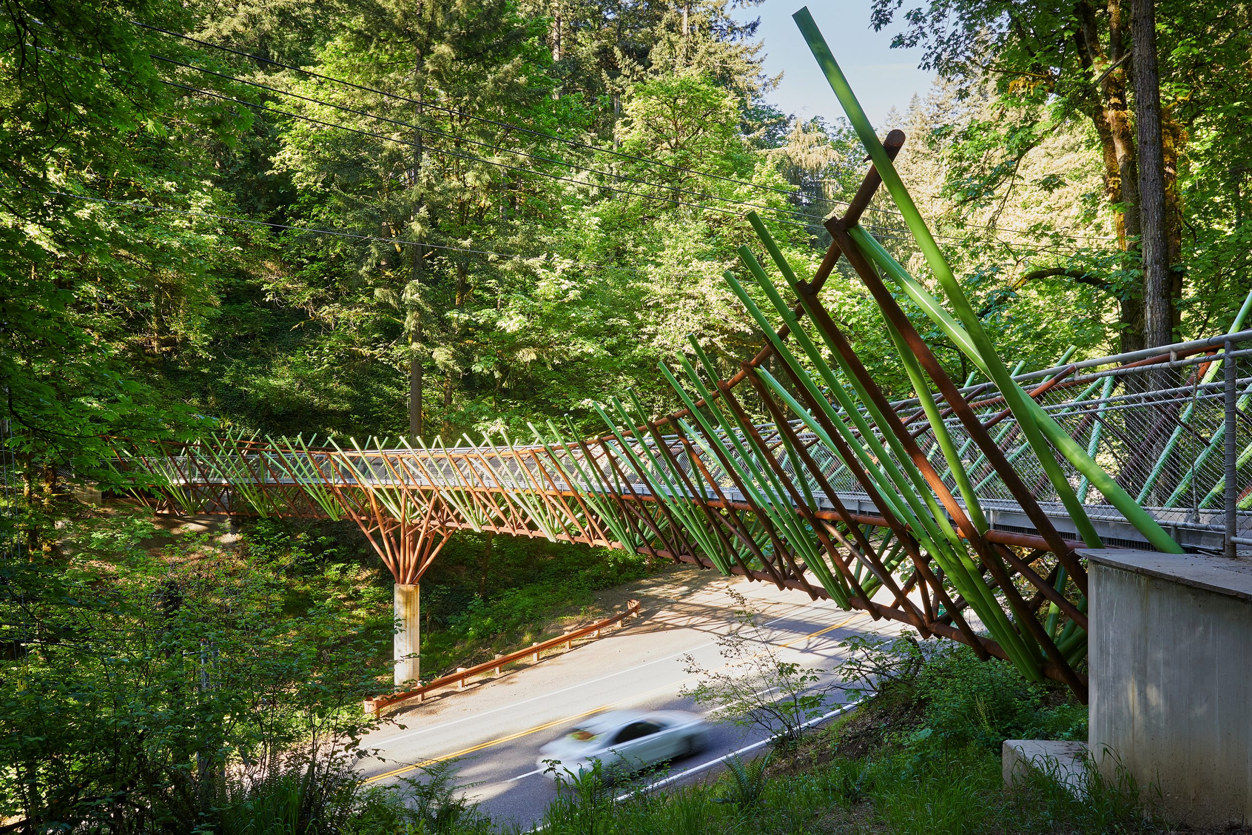 Designed by nationally renowned, Portland-based artist Ed Carpenter, the crossing is intended to blend seamlessly into the natural surroundings. Featuring a walking surface crafted of unique fiberglass panels, the 180-foot bridge curves over Burnside with a 150-foot radius. The sides of the bridge are highlighted by striking green branches that resemble ferns and evergreen needles, and over time the unpainted steel will seal itself with an earthy reddish-brown rust color, further integrating it into its surroundings.