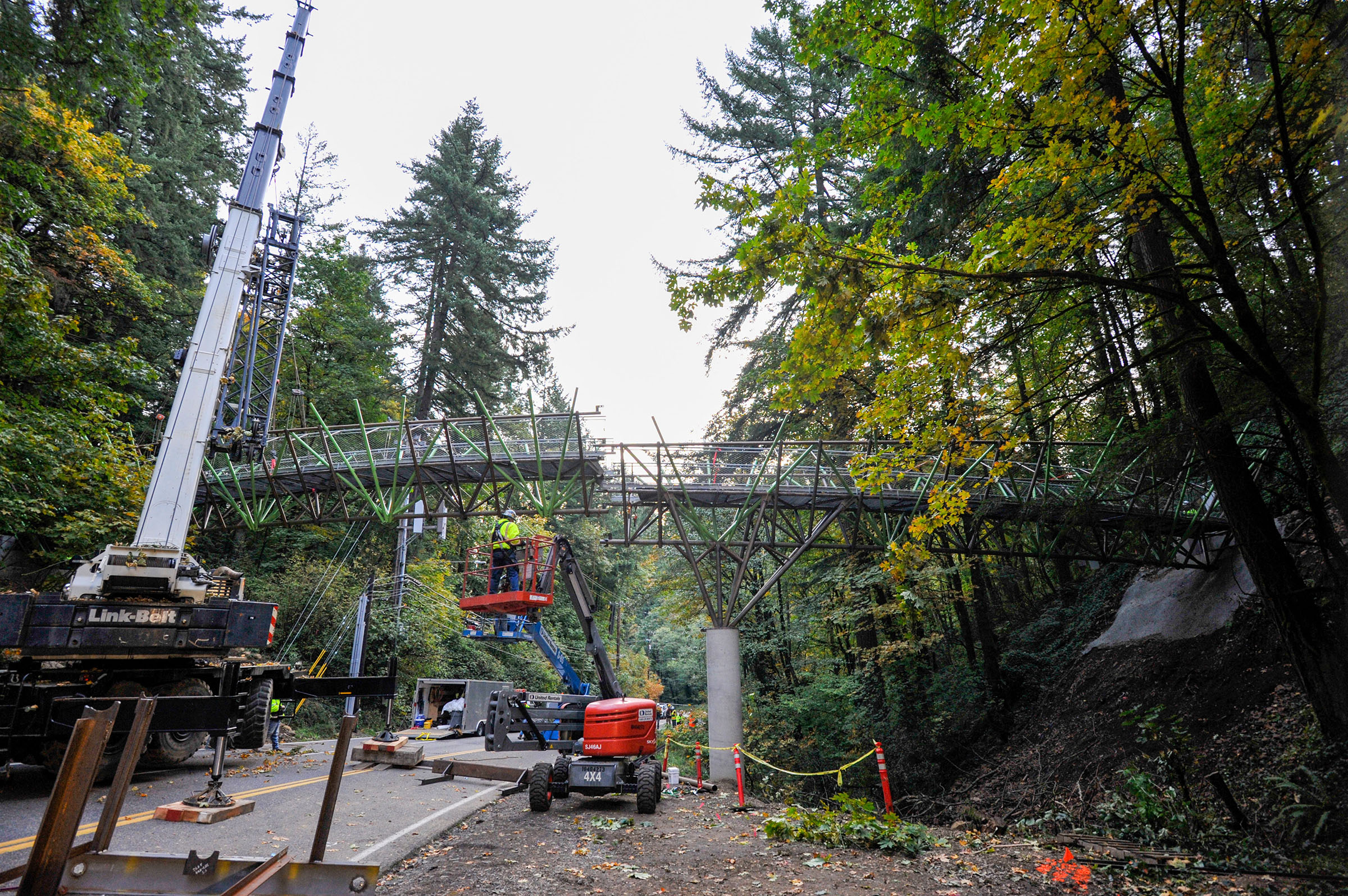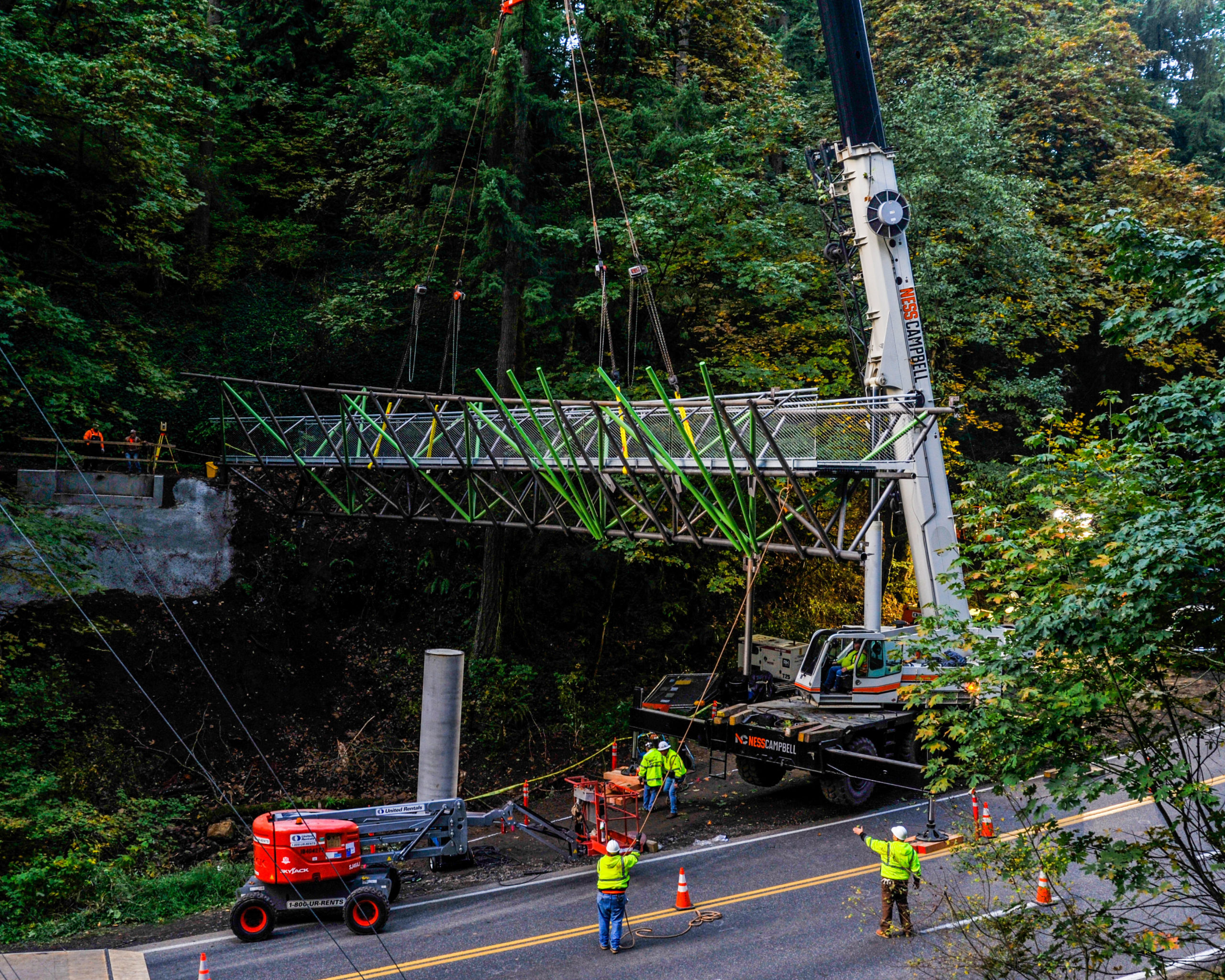 R&H Construction won the contract to oversee fabrication and installation of the crossing in 2016. For over two-years, the general contractor and engineering team performed preconstruction services to help guide final fundraising efforts. During that time, several construction methods and procedures were analyzed for constructability, durability, aesthetics and cost to ensure the highest level of quality and value were achieved. Great attention was paid to properly stewarding the contributions of hundreds of individuals, businesses and government agencies. Another critical element: the bridge would need to be lifted into place quickly to minimize disruptions to Burnside, one of the busiest roads in the region and a major artery for emergency services.