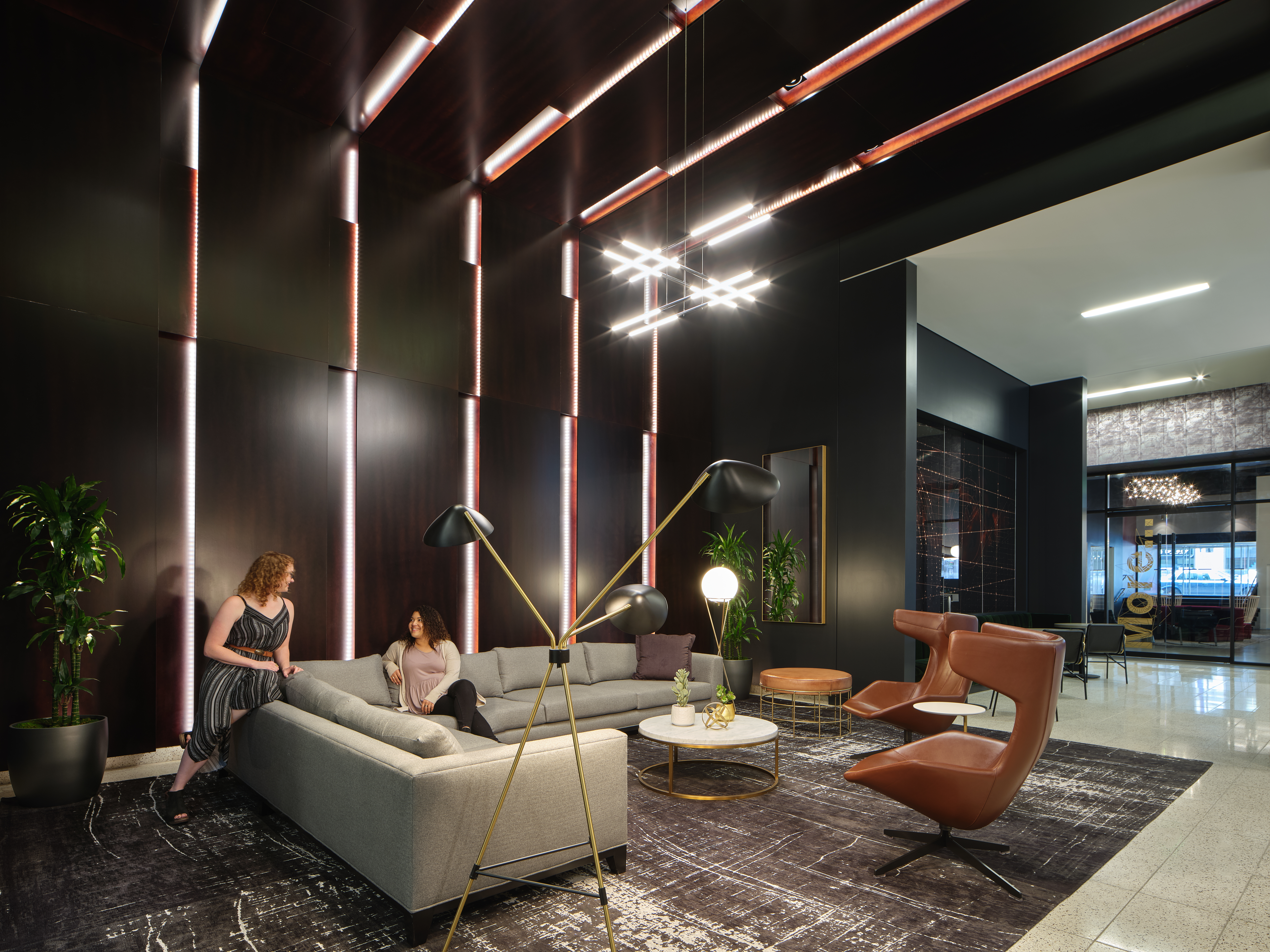 The layout of the lobby did not need a rework, so a majority of the work went into updating the finishes, flooring, and adding unique elements to the space.